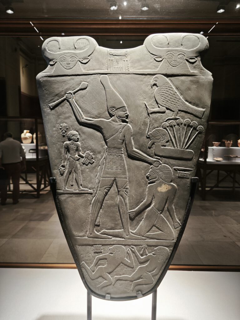Der Mann in der kurzen Schürze packt seinen Gegner fest am Haarschopf. In der rechten Hand schwingt er eine keulenförmige Waffe, bereit zum tödlichen Schlag. Es ist eine Szene von roher Gewalt, die vor über 5.000 Jahren in den Stein einer Prunkpalette gemeißelt wurde. Der Triumphator ist Narmer, jener Herrscher, der am Übergang von der Vorgeschichte zur 1. Dynastie steht.