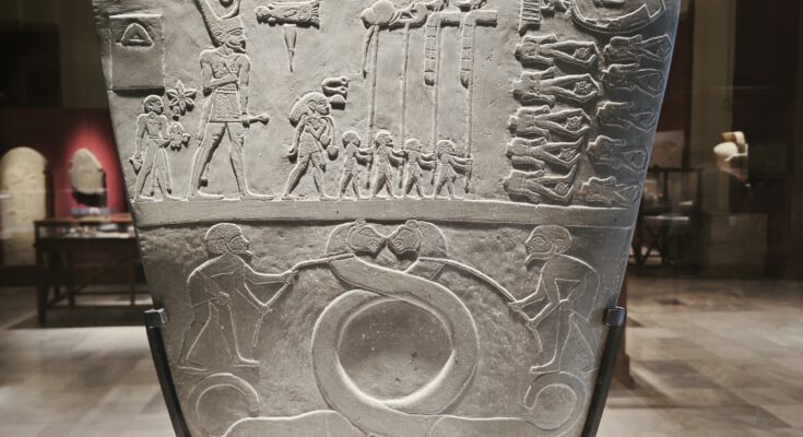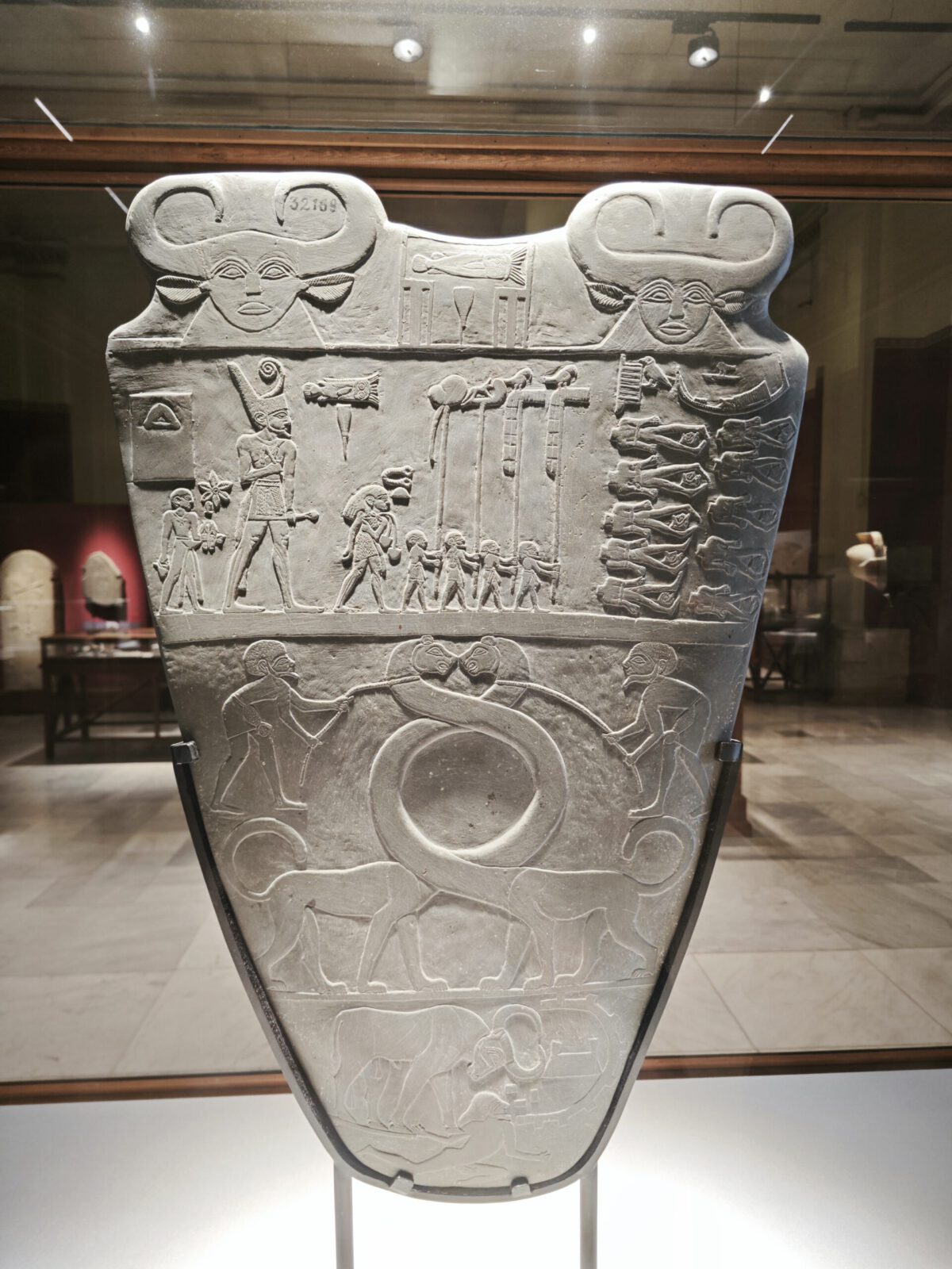 Die Narmer-Palette jedoch sprengt diesen praktischen Rahmen. Mit einer Höhe von 63 Zentimetern ist sie zu groß und zu schwer für die Handhabung im Alltag. Sie ist eine monumentale, sakrale Version eines Gebrauchsgegenstands – ein rituelles Objekt, das dazu bestimmt war, im Tempel des Gottes Horus die Macht des Königs zu verewigen.