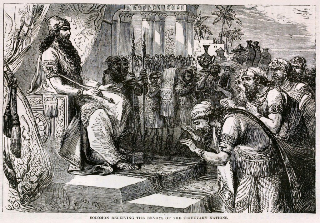 Salomo gilt in der biblischen Überlieferung als der Sohn Davids, der ein geeintes Reich übernahm und zu ungekannter Blüte führte. Er erscheint als weiser Herrscher, als Bauherr des Tempels in Jerusalem und als Mann von weltweitem Ruhm. Historisch ist diese Gestalt schwer zu fassen. Archäologische Spuren eines großen Reiches fehlen. Wahrscheinlich war seine Herrschaft regional begrenzt. Dennoch wurde Salomo in den Erzählungen zum Inbegriff von Weisheit und Reichtum.
