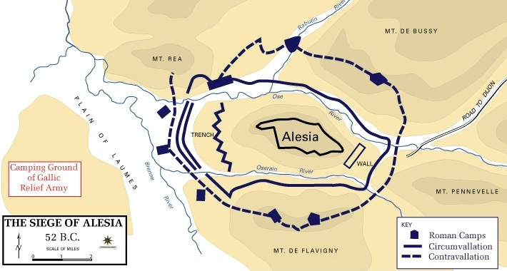 Der Wendepunkt kam mit der Belagerung von Alesia. Vercingetorix zog sich mit seinen Truppen in die befestigte Siedlung zurück. Caesar entschied sich für eine umfassende Einschließung. Die römischen Truppen errichteten Befestigungen nach innen und außen, um sowohl die eingeschlossenen Gegner als auch herannahende Entsatzheere abzuwehren. Die Arbeiten verlangten enorme Disziplin und Organisation. Wochenlang hielten die Legionen ihre Stellungen, trotz Angriffe von außen und Versuchen der Eingeschlossenen, auszubrechen.