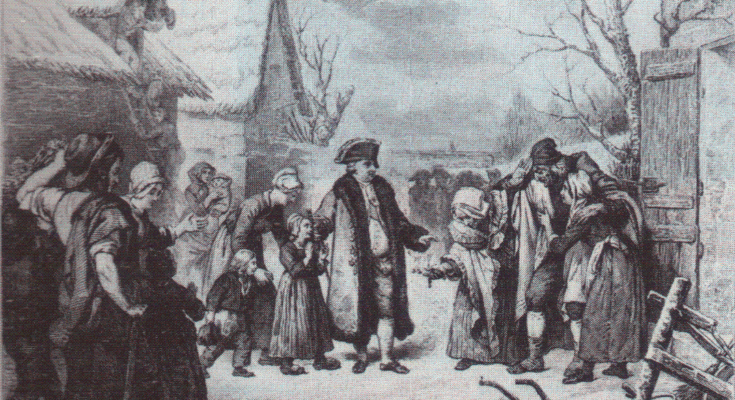 Titel: Ludwig XVI. versorgt die Armen im kalten Winter 1788, aus einem Geschichtsbuch, ca. 1817.