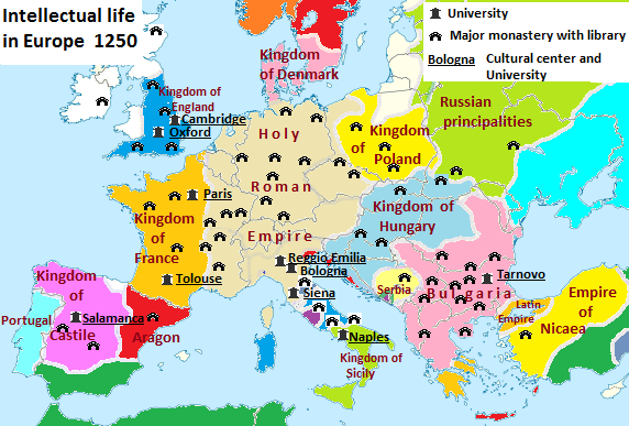 In der Geistesgeschichte entsteht die Scholastik. Gelehrte wie Thomas von Aquin verbinden christliche Lehre mit antiker Philosophie. Universitäten entstehen als neue Zentren der Bildung. Gotische Kathedralen zeugen von technischem Können und religiöser Inbrunst. Doch auch hier verlaufen die Entwicklungen ungleichzeitig: Während Paris bereits 1150 eine Universität besitzt, entsteht die erste deutsche Hochschule erst 1348 in Prag.