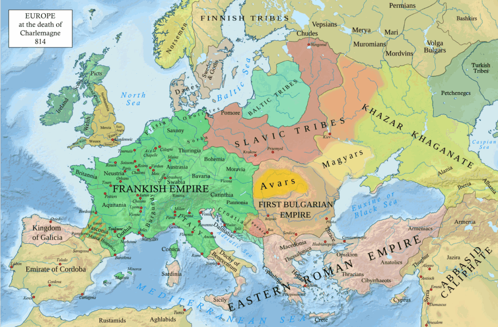 Die Zeit zwischen 500 und 1000 bringt grundlegende Veränderungen mit sich. Im Westen lösen germanische Königreiche das weströmische Kaisertum ab. Die Franken unter Karl dem Großen schaffen um 800 ein neues Kaisertum, das sich als Nachfolger Roms versteht. Gleichzeitig formt sich eine neue Gesellschaftsordnung: Große Herren gewähren Schutz gegen Treue und Dienst, aus freien Bauern werden abhängige Hörige.